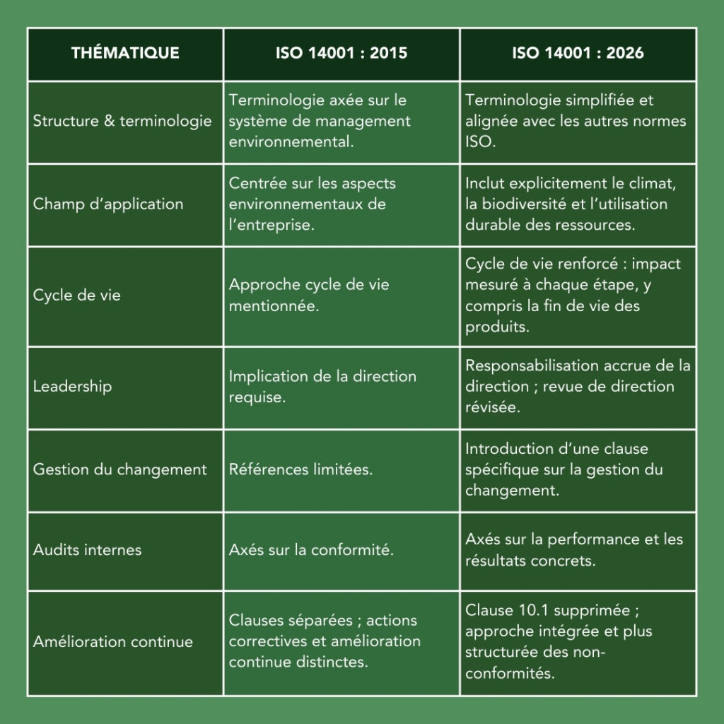 Les principales évolutions concernent l’intégration explicite du climat et de la biodiversité, le renforcement de l’approche cycle de vie, une responsabilisation accrue de la direction, la gestion du changement et une approche plus orientée vers la performance environnementale.