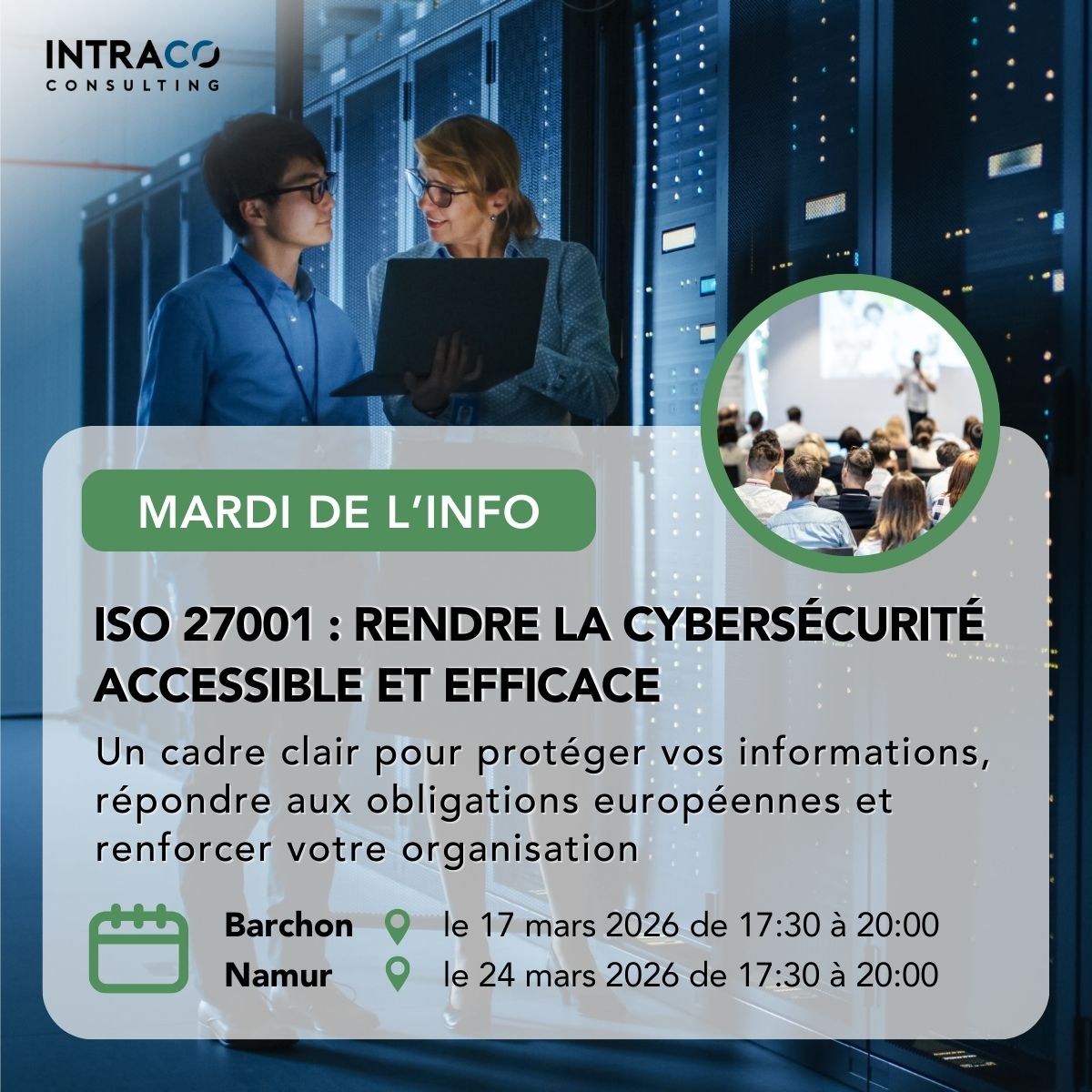Ce 17 mars à Barchon et ce 24 mars à Namur, rejoignez-nous pour découvrir comment la norme ISO 27001 peut structurer efficacement votre cybersécurité et répondre aux obligations européennes.